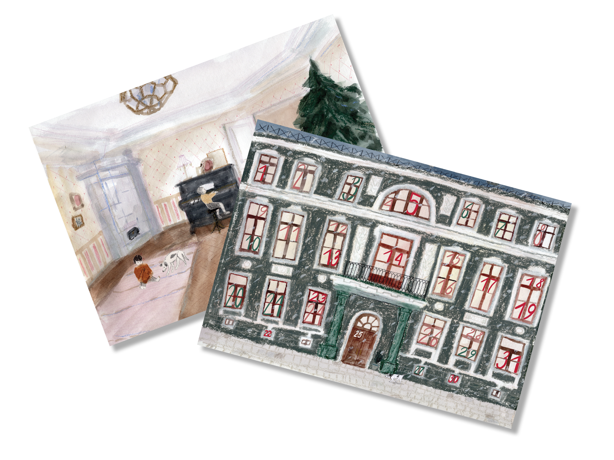 Сюжет этого адвент-календаря — Новый год в большой семье как будто бы еще даже в начале прошлого века — с обязательным атрибутом — пианино, с лошадкой-качалкой, с камином и елкой. Ежедневно открывая по одному окошку, украшай комнату, дари подарки присутствующим на картинке детям, вешай игрушки на елку — и комната начнет оживать. А обложка у этого календаря такая, как будто заглядываешь в окна Эрмитажа.