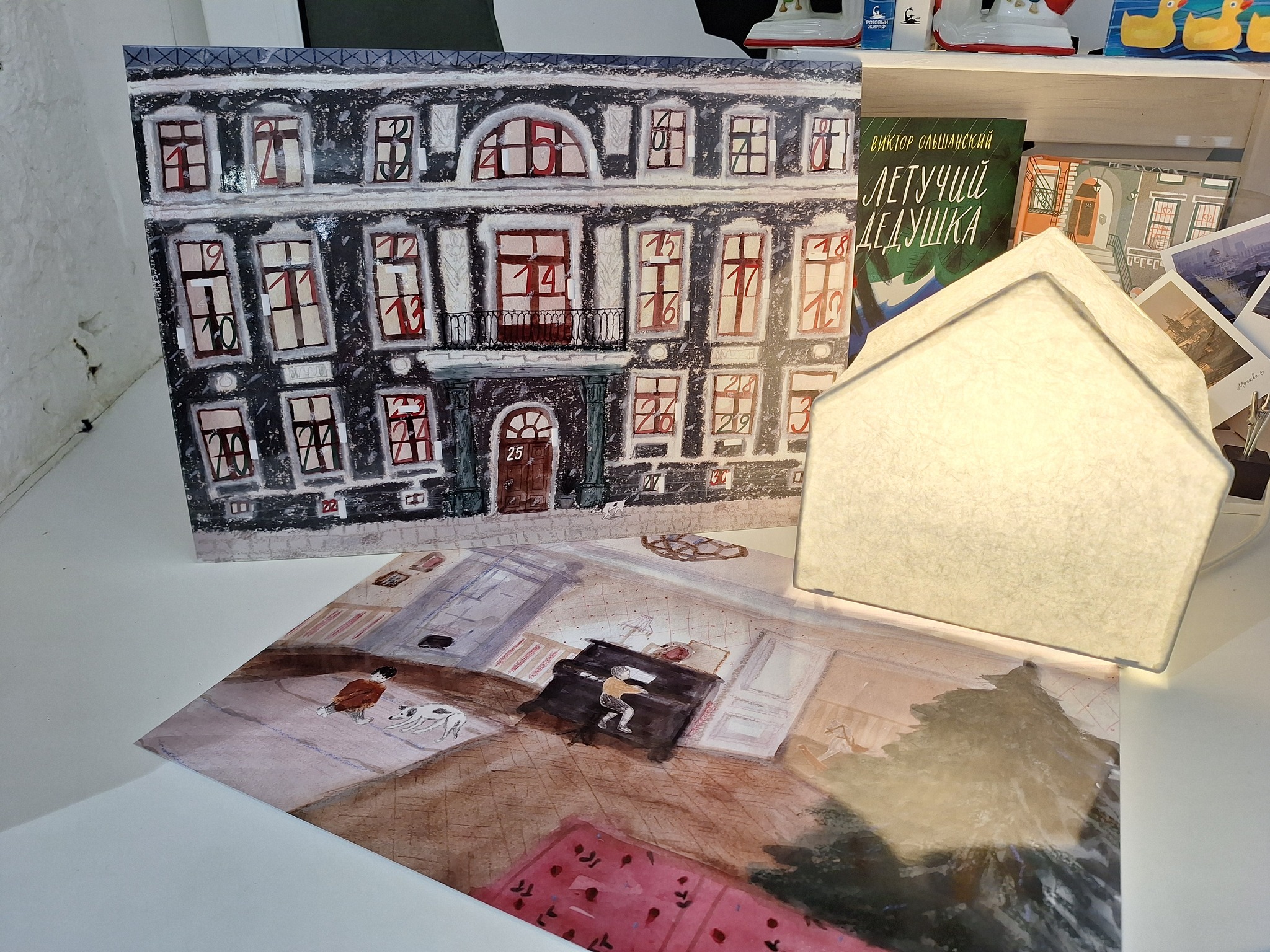 Художница Мария Ивашкина известна своей «Историей книжных магазинов» и комиксом-путеводителем по Петербургу «Тихий ход». В ее рисунках всегда столько нежности, что это даже вызывает какую-то пронзительную грусть. И календарь «Семейный праздник» — не исключение: вся атмосфера этой комнаты вызывает щемящую тоску — по далекому прошлому, по безвозвратному детству — но наклеивая на открытку наклейки из окошек, можно снова окунуться и в эту атмосферу, и вспомнить детство со своими любимыми игрушками, и приблизить праздник!