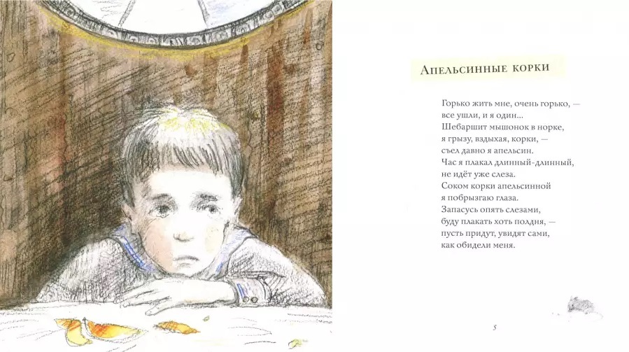 Мария Моравская (1889-1947) - поэт Серебряного века. Была участницей литературного объединения «Цех поэтов». Ее лирику ценили Гиппиус и Волошин, Брюсов и Эренбург. Сотрудничала с детскими журналами «Тропинка» и «Галчонок». В 1914 году, одновременно с первыми «взрослыми» сборниками «На пристани» и «Стихи о войне», выходит книжка ее стихов для детей - «Апельсинные корки», о которой весьма хорошо отзывались и читатели, и критики, и даже поэты. Моравская заговорила с детьми совершенно новым языком: без нравоучений, но с сочувствием к их переживаниям.