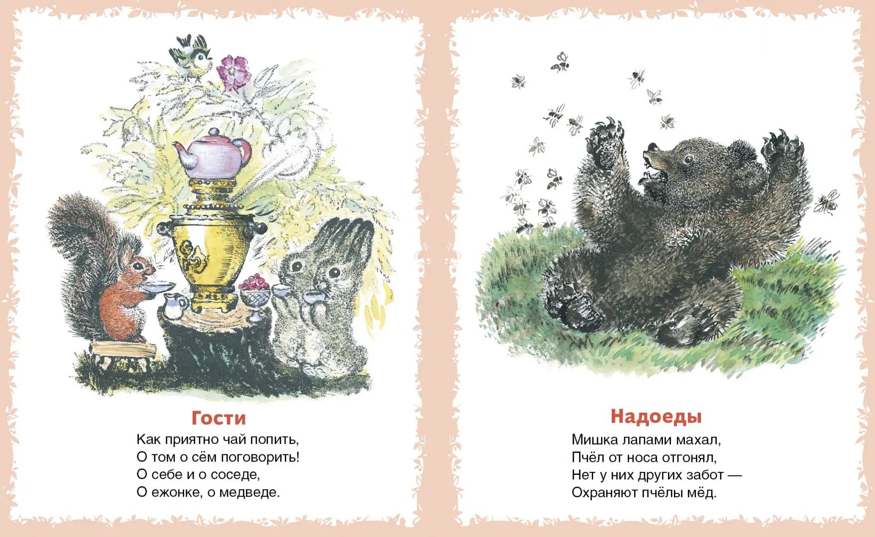 Перед вами самое полное собрание знаменитых "Шуток" Евгения Чарушина, дополненное рисунками и текстами из архива семьи Чарушиных. Братцы-медвежата, медведица, поющая колыбельную, пляшущие заяц и зайчиха стали любимыми образами Евгения Чарушина. В конце 1940-х годов он повторил эти сюжеты в скульптурах для Ленинградского фарфорового завода. Певучие тексты "Шуток" высмеивают жадность и гордыню, учат дружить, радоваться и удивляться.