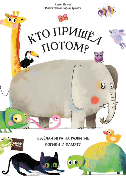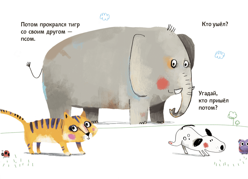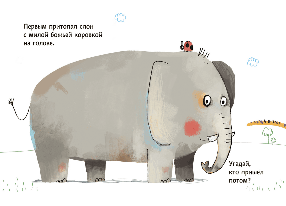 В этой веселой книге собралась целая процессия симпатичных животных. Первым притопал слон с божьей коровкой на спине. За ним — тигр со своим другом псом. Кто ушел? Кто пришел потом? Попробуйте угадать, кто бы это мог быть.