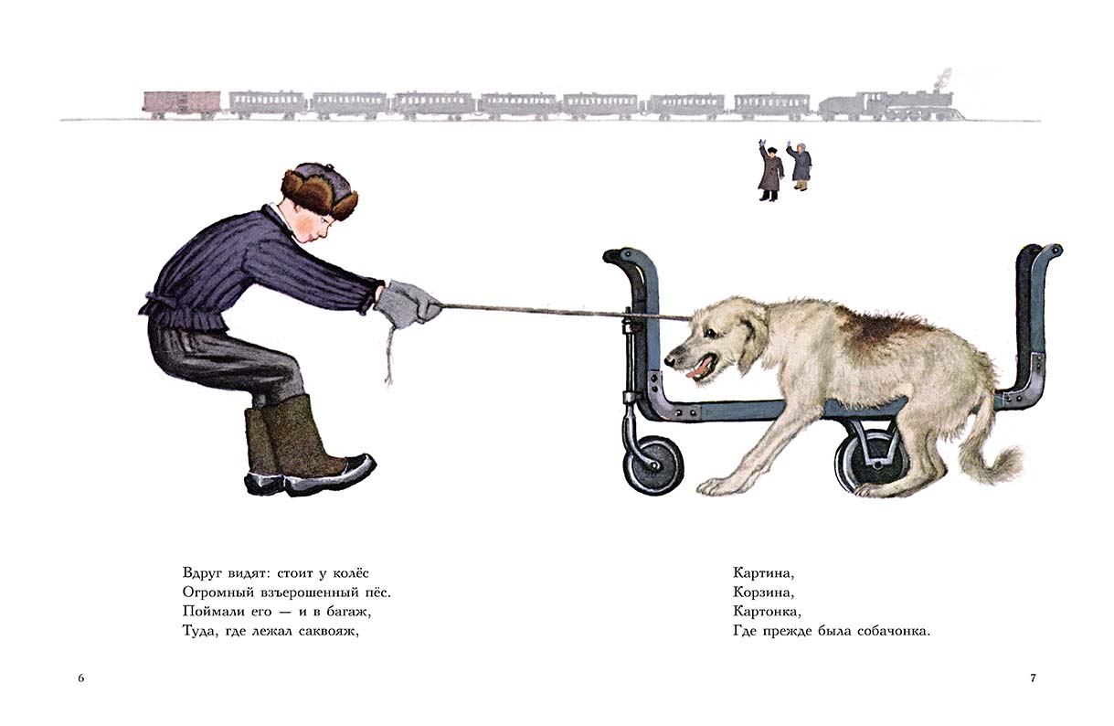 Героиня стихотворения, запасливая дама (барыня), отправляясь в дальнюю поездку, сдала в багаж много разных предметов, а ещё маленькую собачонку. Однако за время пути собачонка внезапно подросла и превратилась в «огромного взъерошенного пса». Поэт весело перечисляет на каждой странице неизменный список вещей: «диван, чемодан, саквояж, картину, корзину, картонку», — как будто колеса поезда ритмично постукивают на стыках и «везут» через всю книжку этот внушительных размеров багаж. А ещё этот перечень очень похож на детскую, моментально запоминающуюся считалку.
