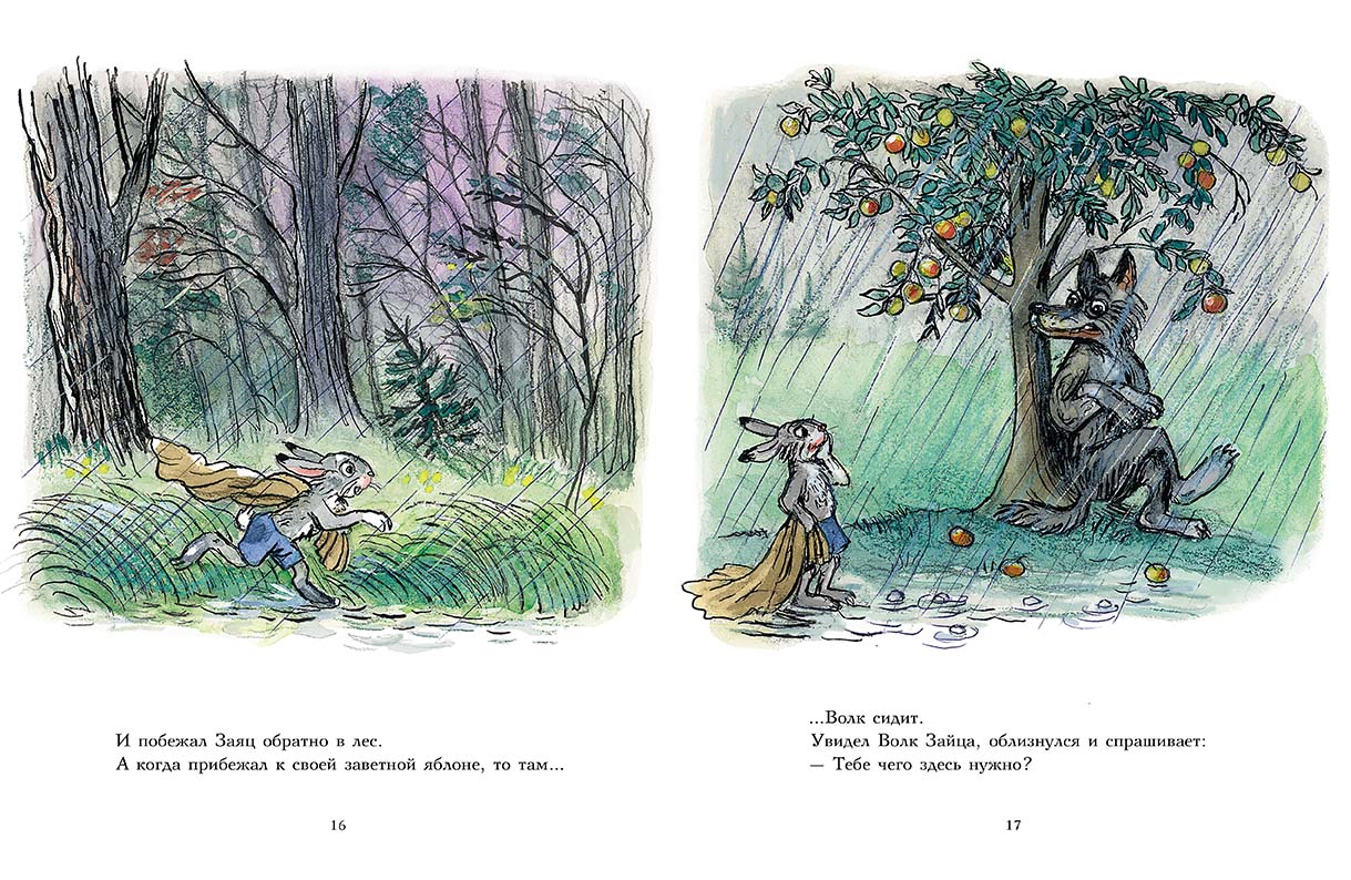 Пришлось Зайцу вернуться к яблоне, чтобы набрать ещё яблок, но не тут-то было. Сначала он попал под ливень с грозой, а добежав до яблони, увидел Волка, который очень обрадовался – такая лакомая добыча сама ему в лапы пришла. Но Заяц ловко накинул на голову волка пустой мешок и был таков.