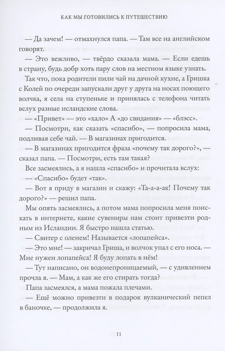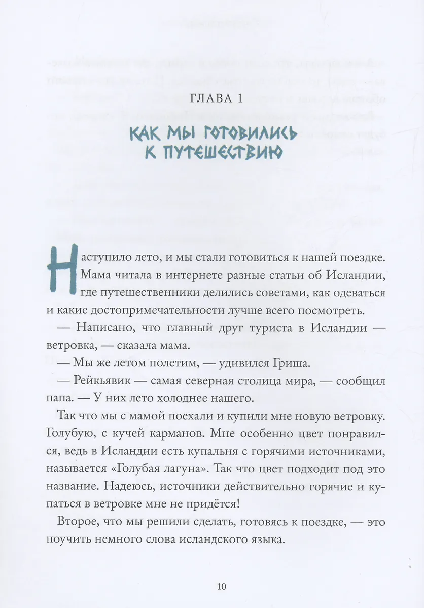 Каким бывает семейное путешествие? Шумным, бодрым, энергичным, весёлым! А если это семейное путешествие на остров, где можно найти больше ста вулканов? А если в дорогу отправляется Маша, которая любит порядок и козочек, шутник Гриша, который вечно попадает в передряги, строгий папа и мама-писательница? Каким будет это путешествие? Ясно одно: оно точно не будет скучным. Семья окунётся в мир викингов, попробует вулканический хлеб, полюбуется китами в музее и тупиками в открытом море, встретится с водопадами и гейзерами, искупается в горячих источниках, узнает название некоторых рун, купит молот Тора и даже заключит договор с эльфами! Не всё проходит идеально: дети и взрослые ссорятся и мирятся, обижаются и радуются. Главная находка, которая ждёт Машу, Гришу и их родителей на острове вулканов — это ощущение семейной поддержки и любви.