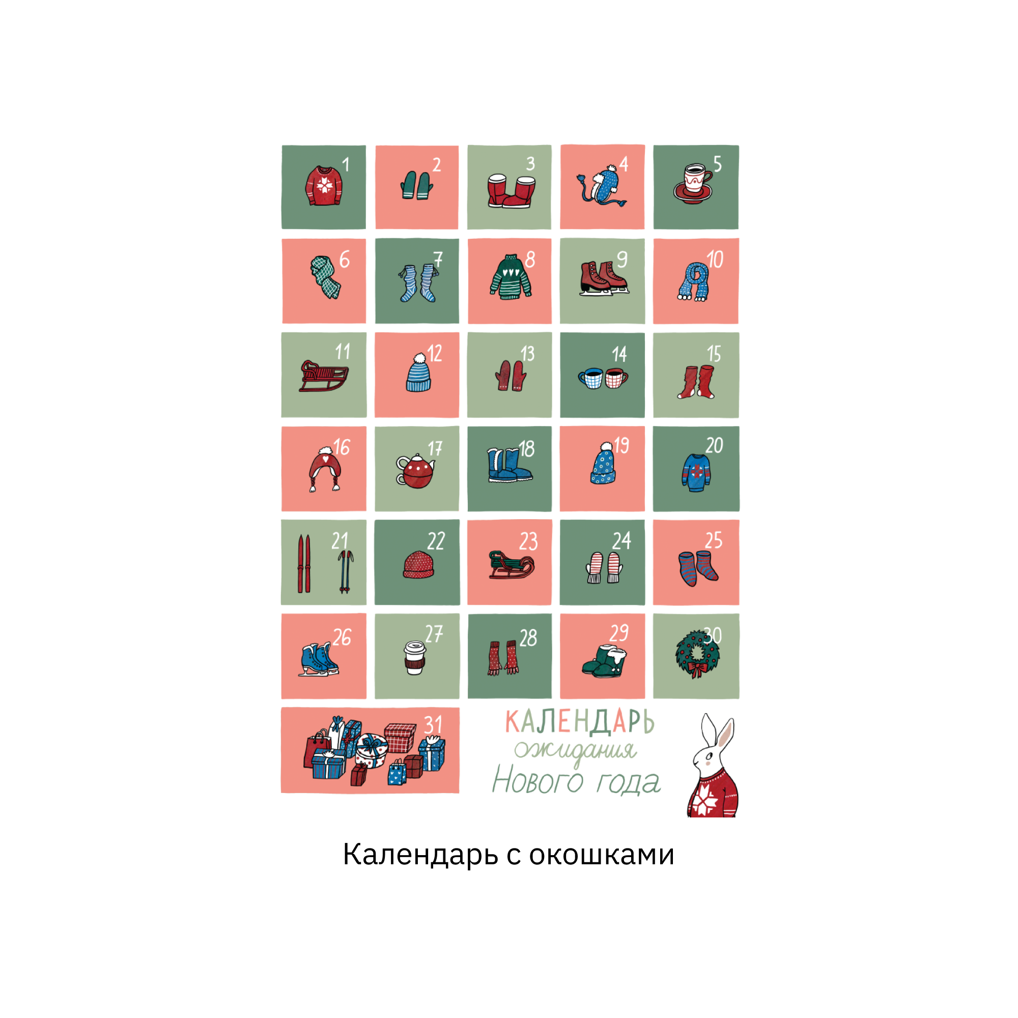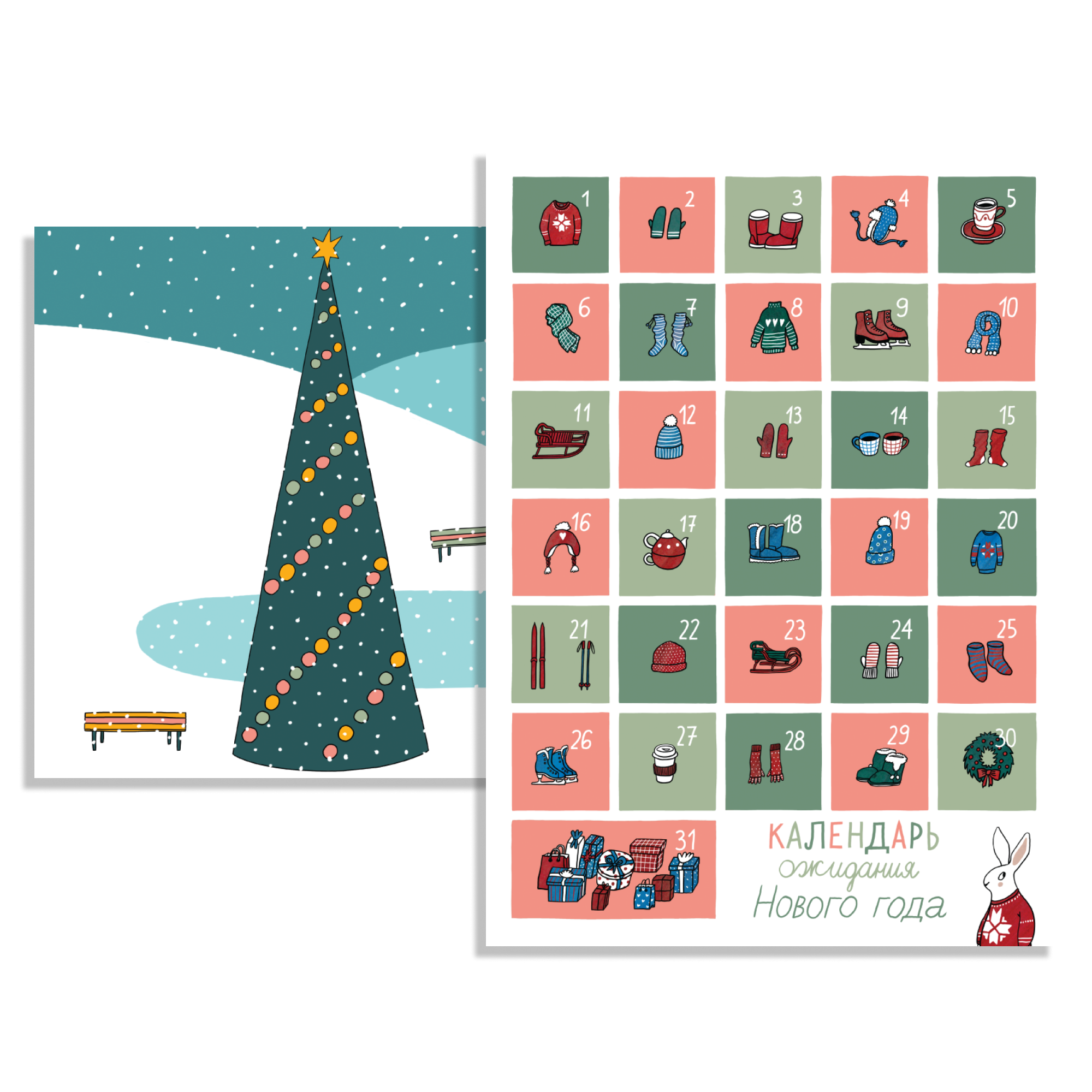 В этом году «Форточка» перезапустила свой супер-раритетный календарь, с которого начиналась вся эта адвент-история: календарь Ани Десницкой, в котором зайцы катаются на коньках вокруг елки, катаются на коньках и санках, весело проводят время в ожидании Нового года.