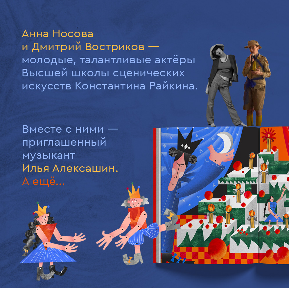 Актеры Высшей школы сценических искусств К.Райкина Аня Носова и Дима Востриков и приглашеный музыкант Илья Алексашин .